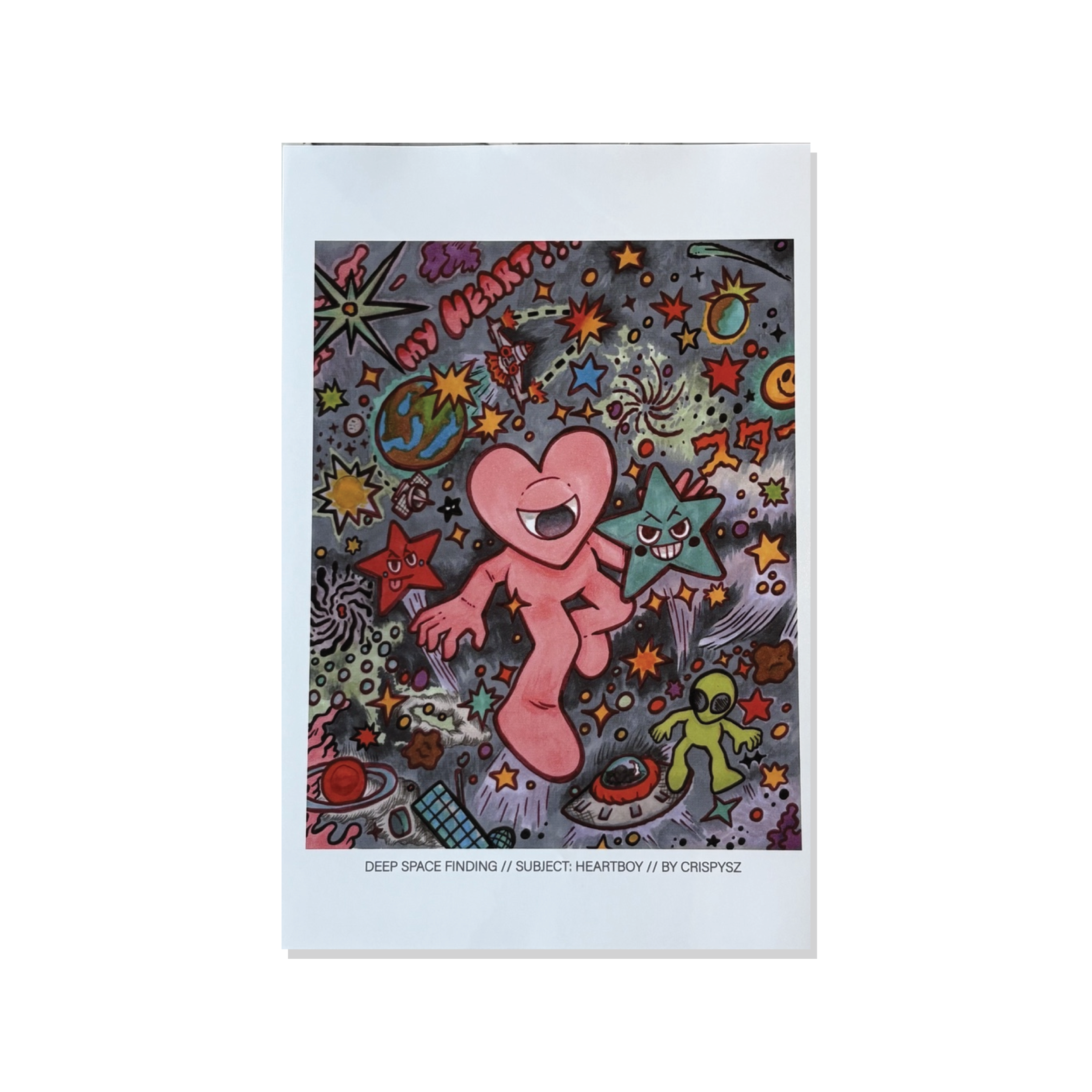 13 x 19 Heartboy art print by Crispysz featuring a colorful deep space scene filled with stars, planets, alien forms, and cosmic details.